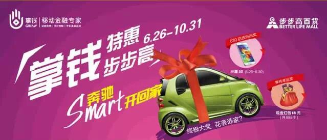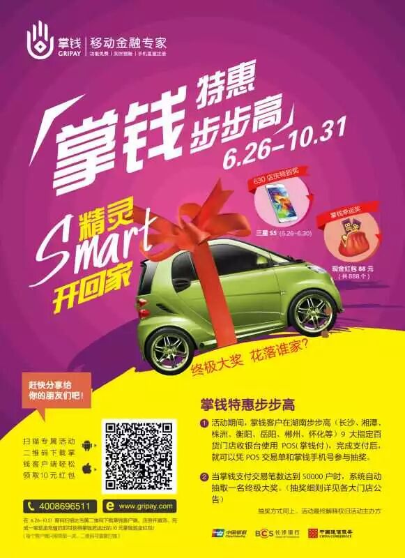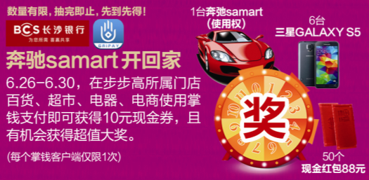 B:是的,你没有听错!会员年中庆长沙银行提供的奔驰smart真的降临步步高啦!所有使用长沙银行“掌钱付款”的客户都有机会!
