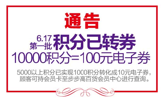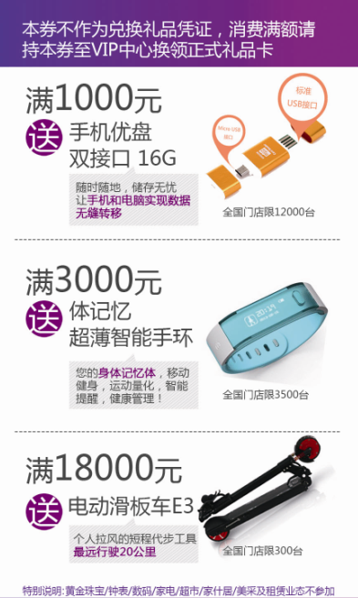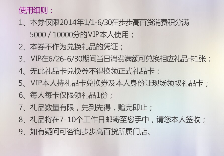 1.门店会员顾客收到礼品兑换券后,6.26~6.30期间在步步高百货门店购物,满额兑换礼品券;