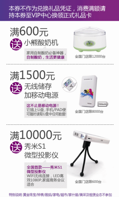 礼品券:会员消费满额后领取礼品的唯一有效凭证