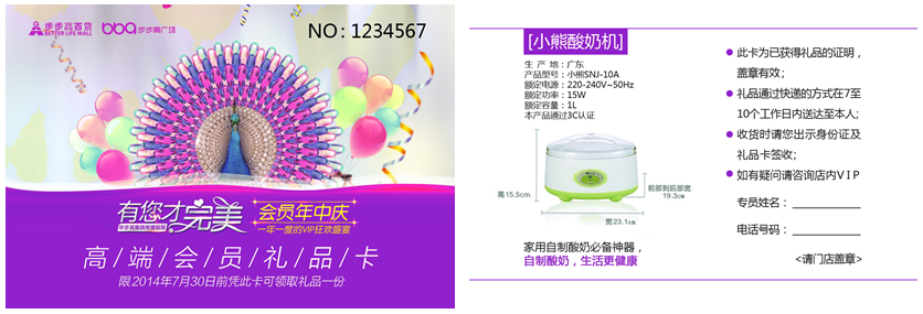 中高端会员凭持券至门店购物达到一定金额之后,可以获得礼品兑换券,填写资料后,由3~7日后步步高商城将礼品派送至您家。