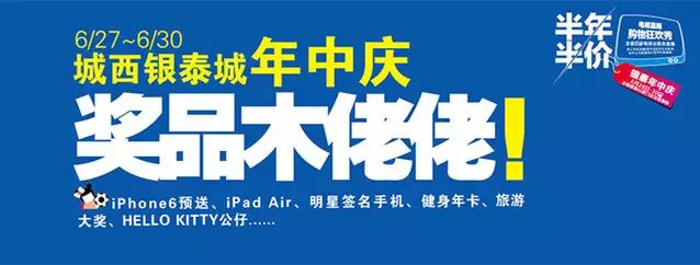 2014年6月28-30日,为银泰年中庆“半年半价”,全国银泰45家门店和银泰网联动同嗨!